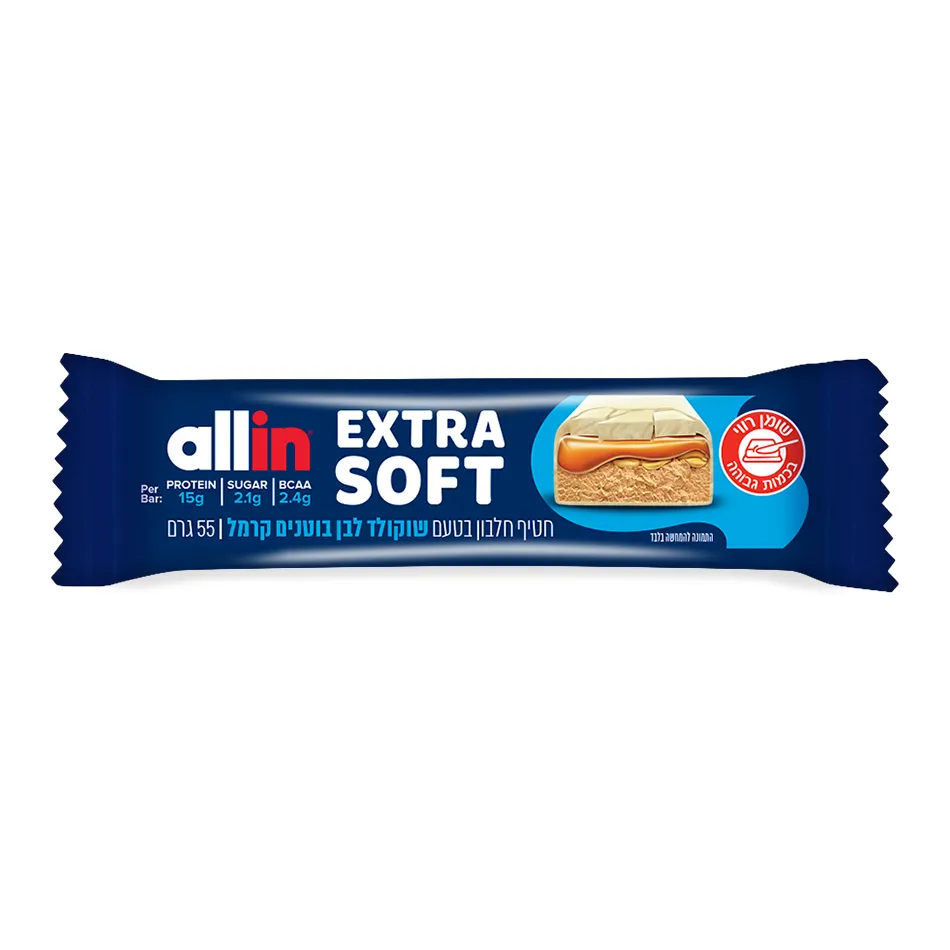 חטיף חלבון רך במיוחד מבית אול אין, בטעם שוקולד לבן עם בוטנים וקרמל. החטיף מכיל 15 גרם חלבון, 2.1 גרם סוכר, ו-2.4 גרם BCAA, ומספק כ-205 קלוריות ליחידה של 55 גרם. החטיף מצופה בשוקולד לבן ומכיל שבבי בוטנים, המעניקים לו טעם עשיר ומרקם נעים. מתאים למתאמנים ולשומרים על אורח חיים בריא.