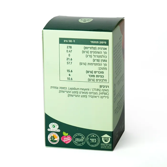 - מכיל חומרים טבעיים בלבד, ללא תוספת סוכר, מלח, צבעי מאכל או חומרים משמרים, אינו מהונדס גנטית, מתאים לצמחונים ולטבעונים