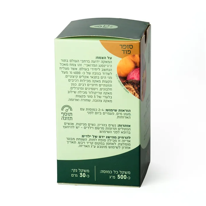 ה"ג'ינסנג הפרואני" לאשה ולגבר! המאקה ידועה ברחבי העולם כ- "ג'ינסנג הפרואני". זהו צמח המאכל היחידי בעולם אשר מצליח לשרוד בגובה של כ- 4000 מטר מעל פני הים בתנאי אקלים קיצוניים, על ידי אגירת רכיבים נדירים הנמצאים רק באנדים הפרואניים. המאקה מכילה ריכוזים גבוהים של גלוקוזינוליטים – אלו הן תרכובות אורגניות ייחודיות המכילות גופרית, אשר נחקרו רבות בשנים האחרונות לגבי סגולותיהן והשפעותיהן החיוביות על האדם. בנוסף, פקעות המאקה מכילות אחוזים גבוהים של מינרלים, ויטמינים, חומצות אמינו וחלבונים, פחמימות מורכבות וסיבים תזונתיים בעלי ערך תזונתי רב, והוא ידוע כ- "מזון-על" (super food). מאקה צהובה – המזינה מכולן: עושר רב של רכיבים תזונתיים מאקה שחורה – הנדירה מכולם: מומלצת מאוד לספורטאים! מאקה אדומה – המתוקה מכולן: פרופיל הרכיבים הצמחיים (פיטוכימיקלים) המגוון ביותר וטעם המתאים במיוחד לילדים (מעל גיל 3)