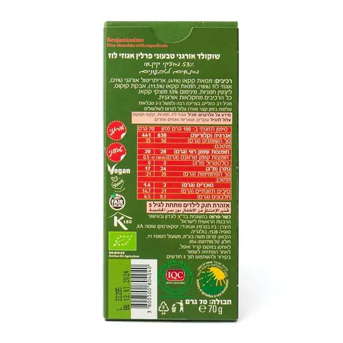 עמוד הבית / שוקולד חטיפים ודגני בוקר / שוקולד אורגני טבעוני פרלין אגוזי לוז | 70 גרם | בנג'מיסימו שוקולד אורגני טבעוני פרלין אגוזי לוז | 70 גרם | בנג'מיסימו עד 3 תשלומים משלוח עד הבית רכישה מאובטחת ₪20.90 מחיר ליח' כמות: המלאי אזל תיאור מוצר שוקולד אורגני טבעוני פרלין אגוזי לוז | 70 גרם | בנג'מיסימו ₪20.90 מחיר ליח' עד 3 תשלומים משלוח עד הבית רכישה מאובטחת המלאי אזל תיאור מוצר מידע נוסף ערכים תזונתיים רכיבים אופן צריכה רגישויות ואלרגנים כשרות במיוחד בשבילך חטיף דגנים תמר וקינמון | 5*22 גרם | פרי מחיר: ₪16.90 + כמות של חטיף דגנים תמר וקינמון | 5*22 גרם | פרי + חטיף חלבון בטעם קרמל מלוח | 60 גרם | פנגיאה מחיר: ₪9.90 + כמות של חטיף חלבון בטעם קרמל מלוח | 60 גרם | פנגיאה + סמוצ'י פירות אדומים אורגני | 100 גרם | נטורה נובה מחיר: ₪5.50 + כמות של סמוצ'י פירות אדומים אורגני | 100 גרם | נטורה נובה + חטיף אננס מיובש בהקפאה | 20 גרם | פרי פריי מחיר: ₪10.90 + כמות של חטיף אננס מיובש בהקפאה | 20 גרם | פרי פריי + מעדן סויה בטעם שוקולד מריר | 4*125 גרם | אלפרו מחיר: ₪17.90 + כמות של מעדן סויה בטעם שוקולד מריר | 4*125 גרם | אלפרו + קרקר חומוס מתובל | 225 גרם |פת במלח מחיר: ₪26.50 + כמות של קרקר חומוס מתובל | 225 גרם |פת במלח + חטיף בננה פקאן בוטנים | 50 גרם | ממה מחיר: ₪9.90 + כמות של חטיף בננה פקאן בוטנים | 50 גרם | ממה + פרכיות תירס | 150 גרם | קורן טינס מחיר: ₪16.90 + כמות של פרכיות תירס | 150 גרם | קורן טינס + סמוצ'י תפוחים אורגני | 100 גרם | נטורה נובה מחיר: ₪5.50 + כמות של סמוצ'י תפוחים אורגני | 100 גרם | נטורה נובה + מרציפן נטו | 200 גרם | שקד תבור מחיר: ₪21.90 + כמות של מרציפן נטו | 200 גרם | שקד תבור + סמוצ'י תפוח תות בננה אורגני | 100 גרם | נטורה נובה מחיר: ₪5.50 + כמות של סמוצ'י תפוח תות בננה אורגני | 100 גרם | נטורה נובה + סמוצ'י אגסים אורגני | 100 גרם | נטורה נובה מחיר: ₪5.50 + כמות של סמוצ'י אגסים אורגני | 100 גרם | נטורה נובה + חטיף תמרים ואגוזי קשיו | 5*25 גרם | פרי מחיר: ₪16.90 + כמות של חטיף תמרים ואגוזי קשיו | 5*25 גרם | פרי + חטיף בטעם שוקולד עם קוקוס שקדים וקפה | 25 גרם | פנגיאה מחיר: ₪4.90 + כמות של חטיף בטעם שוקולד עם קוקוס שקדים וקפה | 25 גרם | פנגיאה + פרכיות כוסמת ללא מלח | 175 גרם | כרם מחיר: ₪11.90 + כמות של פרכיות כוסמת ללא מלח | 175 גרם | כרם + שוקולד חלב ללא סוכר ללא גלוטן | 100 גרם | בלג'יאן מחיר: ₪26.00 + כמות של שוקולד חלב ללא סוכר ללא גלוטן | 100 גרם | בלג'יאן + עכשיו במבצע ספירולינה 5 | 60 כמוסות | ברא צמחים מחיר: ₪89.90 המחיר המקורי היה: ₪89.90.₪69.00המחיר הנוכחי הוא: ₪69.00. + כמות של ספירולינה 5 | 60 כמוסות | ברא צמחים + ליקוריץ גלברידין | 60 כמוסות | ברא צמחים מחיר: ₪139.90 המחיר המקורי היה: ₪139.90.₪109.90המחיר הנוכחי הוא: ₪109.90. + כמות של ליקוריץ גלברידין | 60 כמוסות | ברא צמחים + קאנג נינג וואן סדרת פנדה | 50 מ"ל | ברא צמחים מחיר: ₪105.00 המחיר המקורי היה: ₪105.00.₪83.00המחיר הנוכחי הוא: ₪83.00. + כמות של קאנג נינג וואן סדרת פנדה | 50 מ"ל | ברא צמחים + ברא חמוציות פלוס | 60 כמוסות | ברא מחיר: ₪149.90 המחיר המקורי היה: ₪149.90.₪126.00המחיר הנוכחי הוא: ₪126.00. + כמות של ברא חמוציות פלוס | 60 כמוסות | ברא + קולגן קומפלקס | 60 טבליות | סופהרב מחיר: ₪95.00 המחיר המקורי היה: ₪95.00.₪77.00המחיר הנוכחי הוא: ₪77.00. + כמות של קולגן קומפלקס | 60 טבליות | סופהרב + רעמת האריה | 60 כמוסות | ברא מחיר: ₪135.00 המחיר המקורי היה: ₪135.00.₪109.90המחיר הנוכחי הוא: ₪109.90. + כמות של רעמת האריה | 60 כמוסות | ברא + סייקלפרו | 60 כמוסות | נייצ'רספרו מחיר: ₪139.90 המחיר המקורי היה: ₪139.90.₪120.00המחיר הנוכחי הוא: ₪120.00. + כמות של סייקלפרו | 60 כמוסות | נייצ'רספרו + אורגנואויל | 50 מ"ל | נייצ'רספרו מחיר: ₪115.00 המחיר המקורי היה: ₪115.00.₪93.00המחיר הנוכחי הוא: ₪93.00. + כמות של אורגנואויל | 50 מ"ל | נייצ'רספרו + קומפלקס מס' 7 | 30 כמוסות | סולגאר מחיר: ₪119.90 המחיר המקורי היה: ₪119.90.₪109.90המחיר הנוכחי הוא: ₪109.90. + כמות של קומפלקס מס' 7 | 30 כמוסות | סולגאר + רעמת האריה אבקה אורגנית | 100 גרם | ברא צמחים מ