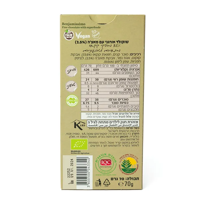 עמוד הבית / שוקולד חטיפים ודגני בוקר / שוקולד אורגני עם מאצ'ה טבעוני | 70 גרם | בנג'מיסימו שוקולד אורגני עם מאצ'ה טבעוני | 70 גרם | בנג'מיסימו עד 3 תשלומים משלוח עד הבית רכישה מאובטחת ₪20.90 מחיר ליח' כמות: המלאי אזל תיאור מוצר שוקולד אורגני עם מאצ'ה טבעוני | 70 גרם | בנג'מיסימו ₪20.90 מחיר ליח' עד 3 תשלומים משלוח עד הבית רכישה מאובטחת המלאי אזל תיאור מוצר מידע נוסף ערכים תזונתיים רכיבים אופן צריכה רגישויות ואלרגנים כשרות במיוחד בשבילך סמוצ'י תפוח תות בננה אורגני | 100 גרם | נטורה נובה מחיר: ₪5.50 + כמות של סמוצ'י תפוח תות בננה אורגני | 100 גרם | נטורה נובה + סמוצ'י אגסים אורגני | 100 גרם | נטורה נובה מחיר: ₪5.50 + כמות של סמוצ'י אגסים אורגני | 100 גרם | נטורה נובה + חטיף תמרים חמוציות ואגוזי לוז | 50 גרם | ממה מחיר: ₪9.90 + כמות של חטיף תמרים חמוציות ואגוזי לוז | 50 גרם | ממה + חטיף תמרים במילוי חמאת קשיו מצופה שוקולד | 6*25 גרם | שקד תבור מחיר: ₪19.90 + כמות של חטיף תמרים במילוי חמאת קשיו מצופה שוקולד | 6*25 גרם | שקד תבור + מרציפן נטו ללא תוספת סוכר | 6*30 גרם | שקד תבור מחיר: ₪29.90 + כמות של מרציפן נטו ללא תוספת סוכר | 6*30 גרם | שקד תבור + ספלטפלקס אורגני | 375 גרם | הרדוף מחיר: ₪22.90 + כמות של ספלטפלקס אורגני | 375 גרם | הרדוף + מעדן סויה בטעם שוקולד | 500 גרם | אלפרו מחיר: ₪17.90 + כמות של מעדן סויה בטעם שוקולד | 500 גרם | אלפרו + מעדן סויה בטעם וניל | 500 גרם | אלפרו מחיר: ₪17.90 + כמות של מעדן סויה בטעם וניל | 500 גרם | אלפרו + חטיף תמרים ואגוזי קשיו | 5*25 גרם | פרי מחיר: ₪16.90 + כמות של חטיף תמרים ואגוזי קשיו | 5*25 גרם | פרי + שוקולד חלב ללא סוכר ללא גלוטן | 100 גרם | בלג'יאן מחיר: ₪26.00 + כמות של שוקולד חלב ללא סוכר ללא גלוטן | 100 גרם | בלג'יאן + מעדן סויה בטעם שוקולד מריר | 4*125 גרם | אלפרו מחיר: ₪17.90 + כמות של מעדן סויה בטעם שוקולד מריר | 4*125 גרם | אלפרו + פרכיות כוסמת עם מלח | 175 גרם | כרם מחיר: ₪11.90 + כמות של פרכיות כוסמת עם מלח | 175 גרם | כרם + חטיף אננס מיובש בהקפאה | 20 גרם | פרי פריי מחיר: ₪10.90 + כמות של חטיף אננס מיובש בהקפאה | 20 גרם | פרי פריי + פרכיות תירס | 150 גרם | קורן טינס מחיר: ₪16.90 + כמות של פרכיות תירס | 150 גרם | קורן טינס + חטיף בננות מיובש בהקפאה | 20 גרם | פרי פריי מחיר: ₪10.90 + כמות של חטיף בננות מיובש בהקפאה | 20 גרם | פרי פריי + חטיף קינואה טחינה ואגוזים | 30 גרם | ממה מחיר: ₪8.90 + כמות של חטיף קינואה טחינה ואגוזים | 30 גרם | ממה + עכשיו במבצע זנב התרנגול | 60 כמוסות | טרסט דה פנגי מחיר: ₪250.00 המחיר המקורי היה: ₪250.00.₪220.00המחיר הנוכחי הוא: ₪220.00. + כמות של זנב התרנגול | 60 כמוסות | טרסט דה פנגי + ברא מגן סירופ | 100 מ"ל | ברא צמחים מחיר: ₪75.00 המחיר המקורי היה: ₪75.00.₪60.00המחיר הנוכחי הוא: ₪60.00. + כמות של ברא מגן סירופ | 100 מ"ל | ברא צמחים + ספירולינה 5 | 60 כמוסות | ברא צמחים מחיר: ₪89.90 המחיר המקורי היה: ₪89.90.₪69.00המחיר הנוכחי הוא: ₪69.00. + כמות של ספירולינה 5 | 60 כמוסות | ברא צמחים + ליקוריץ גלברידין | 60 כמוסות | ברא צמחים מחיר: ₪139.90 המחיר המקורי היה: ₪139.90.₪109.90המחיר הנוכחי הוא: ₪109.90. + כמות של ליקוריץ גלברידין | 60 כמוסות | ברא צמחים + גאן מאו לינג סדרת פנדה | 50 מ"ל | ברא צמחים מחיר: ₪105.00 המחיר המקורי היה: ₪105.00.₪83.00המחיר הנוכחי הוא: ₪83.00. + כמות של גאן מאו לינג סדרת פנדה | 50 מ"ל | ברא צמחים + קאנג נינג וואן סדרת פנדה | 50 מ"ל | ברא צמחים מחיר: ₪105.00 המחיר המקורי היה: ₪105.00.₪83.00המחיר הנוכחי הוא: ₪83.00. + כמות של קאנג נינג וואן סדרת פנדה | 50 מ"ל | ברא צמחים + ברא חמוציות פלוס | 60 כמוסות | ברא מחיר: ₪149.90 המחיר המקורי היה: ₪149.90.₪126.00המחיר הנוכחי הוא: ₪126.00. + כמות של ברא חמוציות פלוס | 60 כמוסות | ברא + ננוגארד אומגה 3 | 120 כמוסות | גרנליקס מחיר: ₪230.00 המחיר המקורי היה: ₪230.00.₪160.00המחיר הנוכחי הוא: ₪160.00. + כמות של ננוגארד אומגה 3 | 120 כמוסות | גרנליקס + קולגן קומפלקס | 60 טבליות | סופהרב מחיר: ₪95.00 המחיר המקורי היה: ₪95.00.₪77.00המחיר הנוכחי הוא: ₪77.00. + כמות של קולגן קומפלקס | 60 טבליות