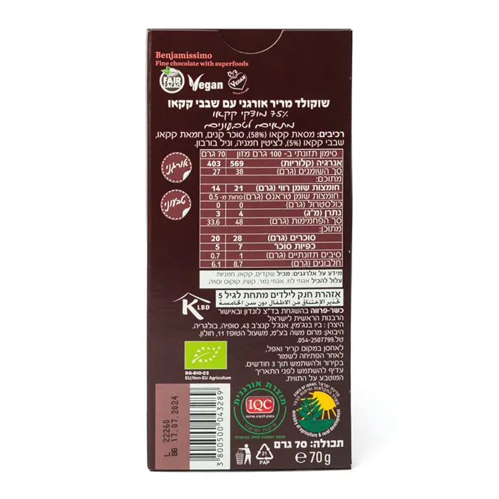 עמוד הבית / שוקולד חטיפים ודגני בוקר / שוקולד מריר אורגני עם שבבי קקאו טבעוני | 70 גרם | בנג'מיסימו שוקולד מריר אורגני עם שבבי קקאו טבעוני | 70 גרם | בנג'מיסימו עד 3 תשלומים משלוח עד הבית רכישה מאובטחת ₪20.90 מחיר ליח' כמות: המלאי אזל תיאור מוצר שוקולד מריר אורגני עם שבבי קקאו טבעוני | 70 גרם | בנג'מיסימו ₪20.90 מחיר ליח' עד 3 תשלומים משלוח עד הבית רכישה מאובטחת המלאי אזל תיאור מוצר מידע נוסף ערכים תזונתיים רכיבים אופן צריכה רגישויות ואלרגנים כשרות במיוחד בשבילך חטיף קינואה טחינה ואגוזים | 30 גרם | ממה מחיר: ₪8.90 + כמות של חטיף קינואה טחינה ואגוזים | 30 גרם | ממה + חטיף אננס מיובש בהקפאה | 20 גרם | פרי פריי מחיר: ₪10.90 + כמות של חטיף אננס מיובש בהקפאה | 20 גרם | פרי פריי + חטיף אגסים מיובש בהקפאה | 20 גרם | פרי פריי מחיר: ₪10.90 + כמות של חטיף אגסים מיובש בהקפאה | 20 גרם | פרי פריי + מרציפן נטו ללא תוספת סוכר | 6*30 גרם | שקד תבור מחיר: ₪29.90 + כמות של מרציפן נטו ללא תוספת סוכר | 6*30 גרם | שקד תבור + חטיף בננה פקאן בוטנים | 50 גרם | ממה מחיר: ₪9.90 + כמות של חטיף בננה פקאן בוטנים | 50 גרם | ממה + ספלטפלקס אורגני | 375 גרם | הרדוף מחיר: ₪22.90 + כמות של ספלטפלקס אורגני | 375 גרם | הרדוף + פרכיות כוסמת ללא מלח | 175 גרם | כרם מחיר: ₪11.90 + כמות של פרכיות כוסמת ללא מלח | 175 גרם | כרם + חטיף דגנים עם שוקולד ואגוזים | 5*20 גרם | פרי מחיר: ₪16.90 + כמות של חטיף דגנים עם שוקולד ואגוזים | 5*20 גרם | פרי + טרפלס תמרים וקקאו | 280 גרם | ממה מחיר: ₪36.90 + כמות של טרפלס תמרים וקקאו | 280 גרם | ממה + פרכיות תירס עם שומשום | 150 גרם | קורן טינס מחיר: ₪16.90 + כמות של פרכיות תירס עם שומשום | 150 גרם | קורן טינס + ברנפלקס אורגני פתיתי תירס קלויים | 375 גרם | הרדוף מחיר: ₪22.50 + כמות של ברנפלקס אורגני פתיתי תירס קלויים | 375 גרם | הרדוף + חטיף תמרים ואגוזי קשיו | 5*25 גרם | פרי מחיר: ₪16.90 + כמות של חטיף תמרים ואגוזי קשיו | 5*25 גרם | פרי + פרכיות תירס | 150 גרם | קורן טינס מחיר: ₪16.90 + כמות של פרכיות תירס | 150 גרם | קורן טינס + חטיף חלבון בטעם קרמל מלוח | 60 גרם | פנגיאה מחיר: ₪9.90 + כמות של חטיף חלבון בטעם קרמל מלוח | 60 גרם | פנגיאה + חטיף תמרים במילוי חמאת קשיו מצופה שוקולד | 6*25 גרם | שקד תבור מחיר: ₪19.90 + כמות של חטיף תמרים במילוי חמאת קשיו מצופה שוקולד | 6*25 גרם | שקד תבור + חטיף חלבון בטעם וניל וקפה | 60 גרם | פנגיאה מחיר: ₪9.90 + כמות של חטיף חלבון בטעם וניל וקפה | 60 גרם | פנגיאה + עכשיו במבצע ברא מגן סירופ | 100 מ"ל | ברא צמחים מחיר: ₪75.00 המחיר המקורי היה: ₪75.00.₪60.00המחיר הנוכחי הוא: ₪60.00. + כמות של ברא מגן סירופ | 100 מ"ל | ברא צמחים + ספירולינה 5 | 60 כמוסות | ברא צמחים מחיר: ₪89.90 המחיר המקורי היה: ₪89.90.₪69.00המחיר הנוכחי הוא: ₪69.00. + כמות של ספירולינה 5 | 60 כמוסות | ברא צמחים + ליקוריץ גלברידין | 60 כמוסות | ברא צמחים מחיר: ₪139.90 המחיר המקורי היה: ₪139.90.₪109.90המחיר הנוכחי הוא: ₪109.90. + כמות של ליקוריץ גלברידין | 60 כמוסות | ברא צמחים + קאנג נינג וואן סדרת פנדה | 50 מ"ל | ברא צמחים מחיר: ₪105.00 המחיר המקורי היה: ₪105.00.₪83.00המחיר הנוכחי הוא: ₪83.00. + כמות של קאנג נינג וואן סדרת פנדה | 50 מ"ל | ברא צמחים + ברא חמוציות פלוס | 60 כמוסות | ברא מחיר: ₪149.90 המחיר המקורי היה: ₪149.90.₪126.00המחיר הנוכחי הוא: ₪126.00. + כמות של ברא חמוציות פלוס | 60 כמוסות | ברא + קולגן קומפלקס | 60 טבליות | סופהרב מחיר: ₪95.00 המחיר המקורי היה: ₪95.00.₪77.00המחיר הנוכחי הוא: ₪77.00. + כמות של קולגן קומפלקס | 60 טבליות | סופהרב + רעמת האריה | 60 כמוסות | ברא מחיר: ₪135.00 המחיר המקורי היה: ₪135.00.₪109.90המחיר הנוכחי הוא: ₪109.90. + כמות של רעמת האריה | 60 כמוסות | ברא + סייקלפרו | 60 כמוסות | נייצ'רספרו מחיר: ₪139.90 המחיר המקורי היה: ₪139.90.₪120.00המחיר הנוכחי הוא: ₪120.00. + כמות של סייקלפרו | 60 כמוסות | נייצ'רספרו + אורגנואויל | 50 מ"ל | נייצ'רספרו מחיר: ₪115.00 המחיר המקורי היה: ₪115.00.₪93.00המחיר הנוכחי הוא: ₪93.00. + כמות של אורגנואויל | 50 מ"ל | נייצ'רספרו + קומפלקס מס' 7 | 30 כמוסות | סולגא