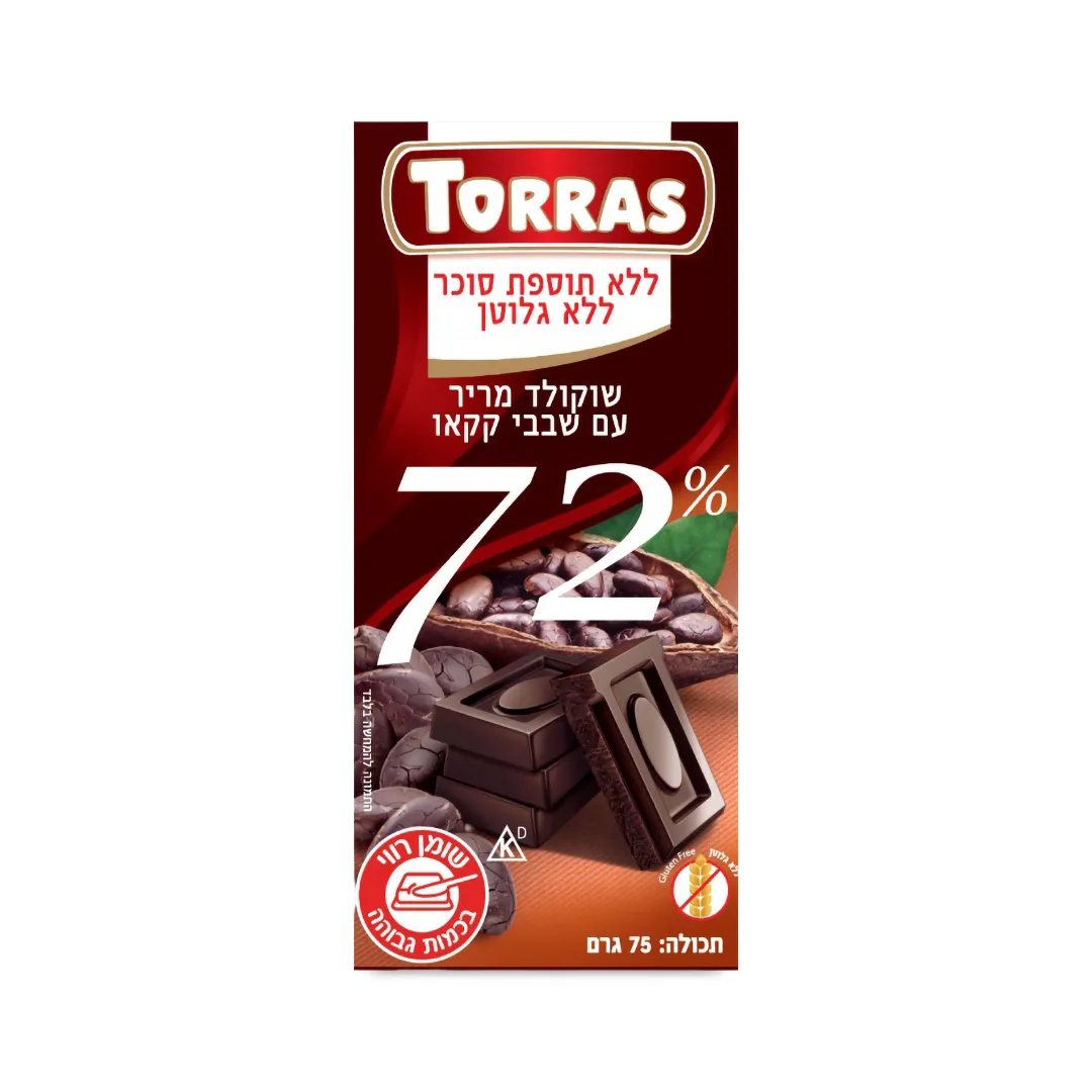 שוקולד מריר 72% ללא סוכר עם שבבי קקאו | 75 גרם | טוראס